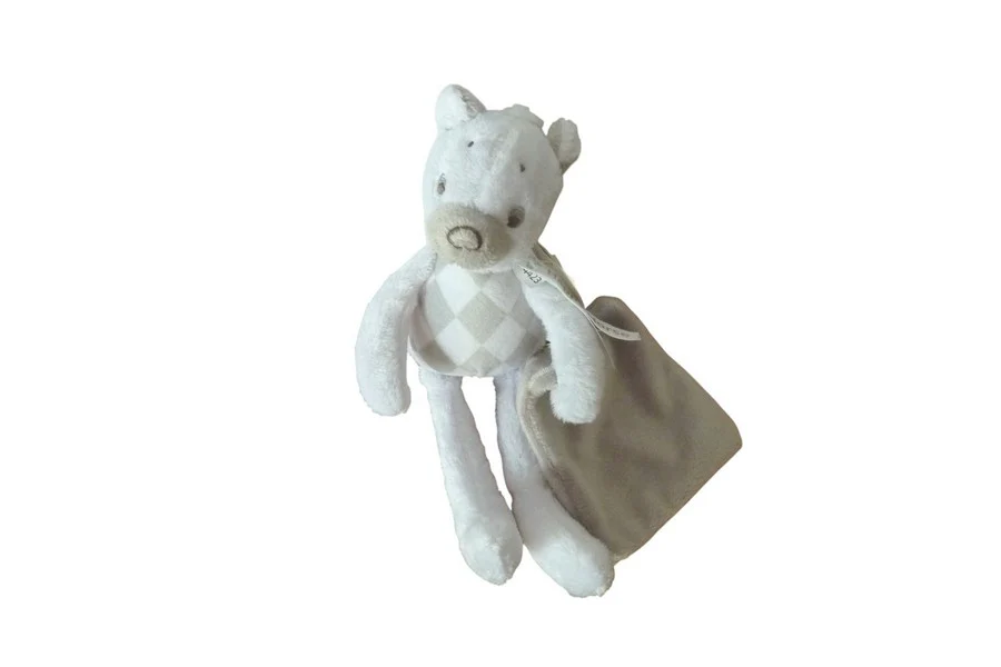 Cette peluche ours Happy Horse mesurant environ 24 cm séduit par son pelage blanc et gris et son ventre quadrillé en losanges blancs et gris. Elle tient un petit mouchoir gris de 9,5×9,5 cm ajoutant une touche ludique et réconfortante. Douce et agréable à câliner, elle devient rapidement un compagnon rassurant pour les tout-petits et incarne parfaitement le doudou d’enfance à chérir.