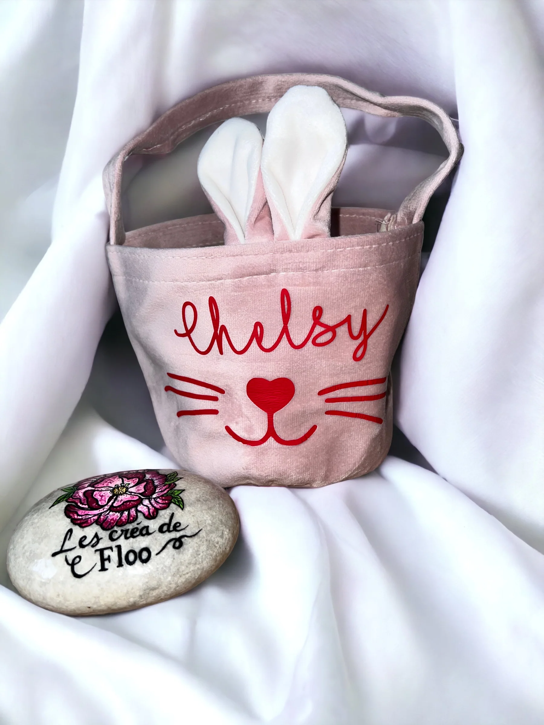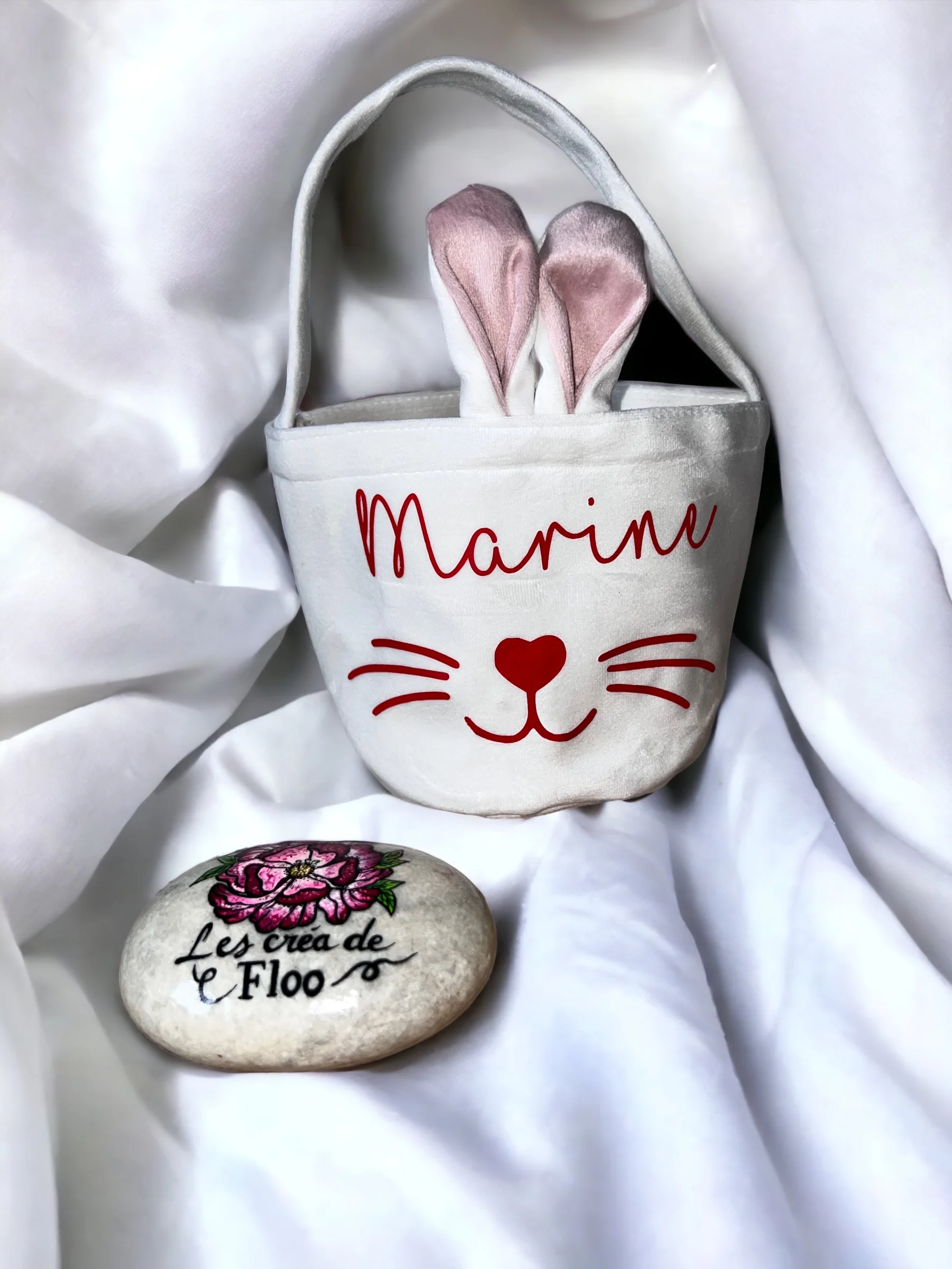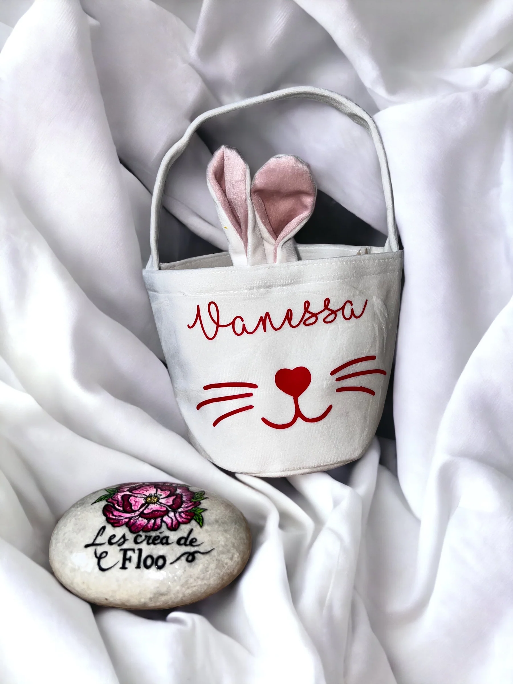 Personnalisable avec le prenom/texte de votre choix ce petit panier avec les oreilles et la petite queue du lapin sera un cadeau idéal pour Pâques.