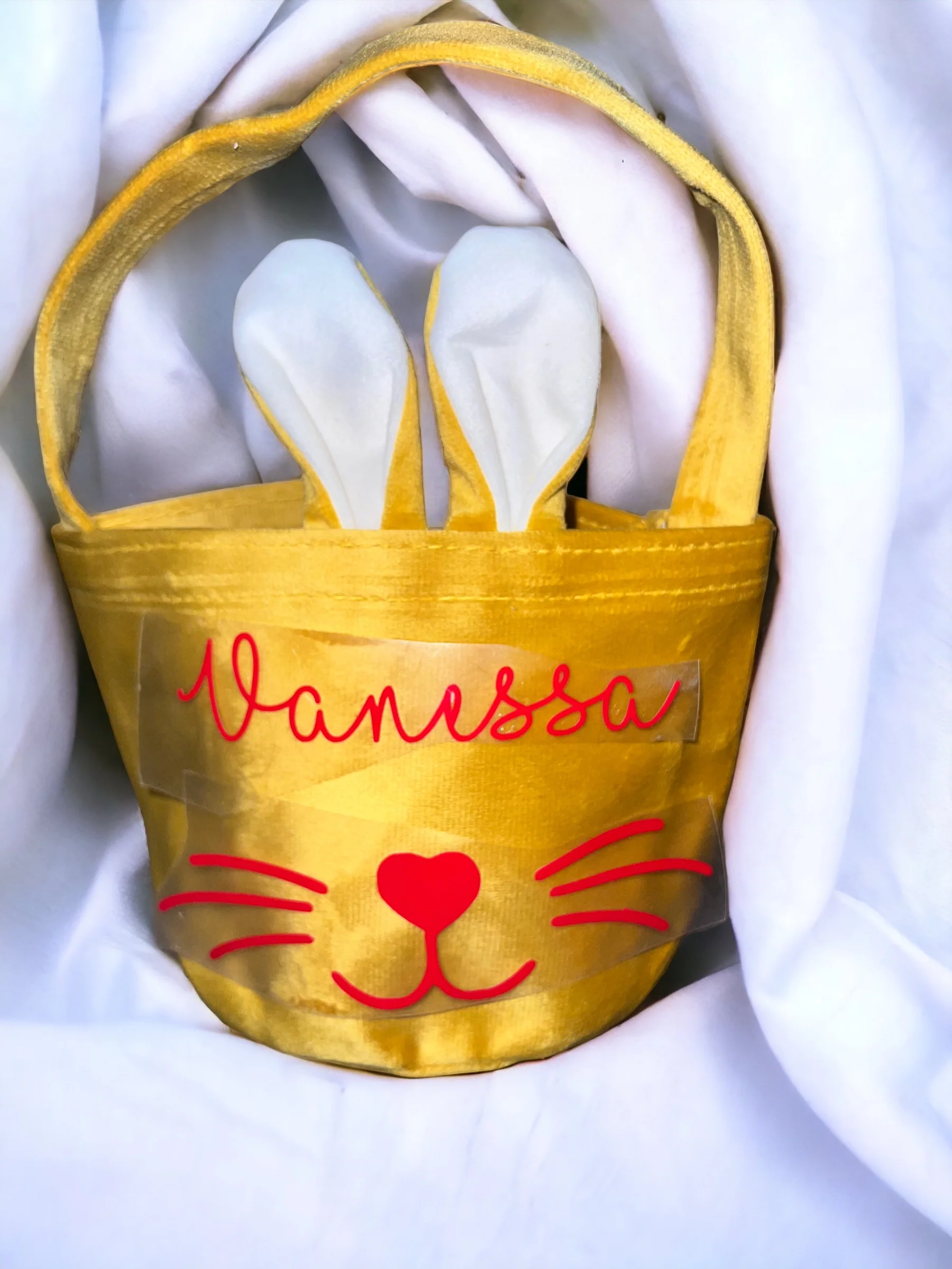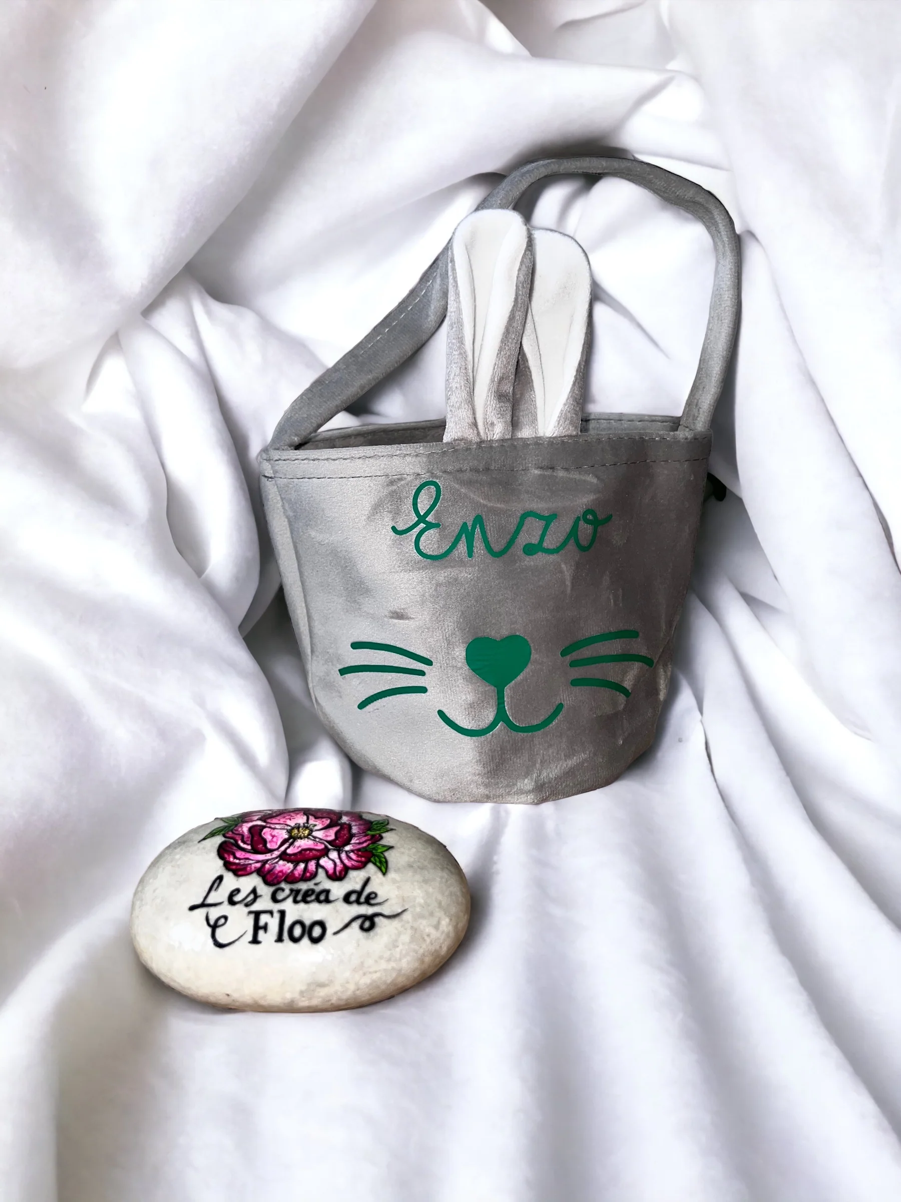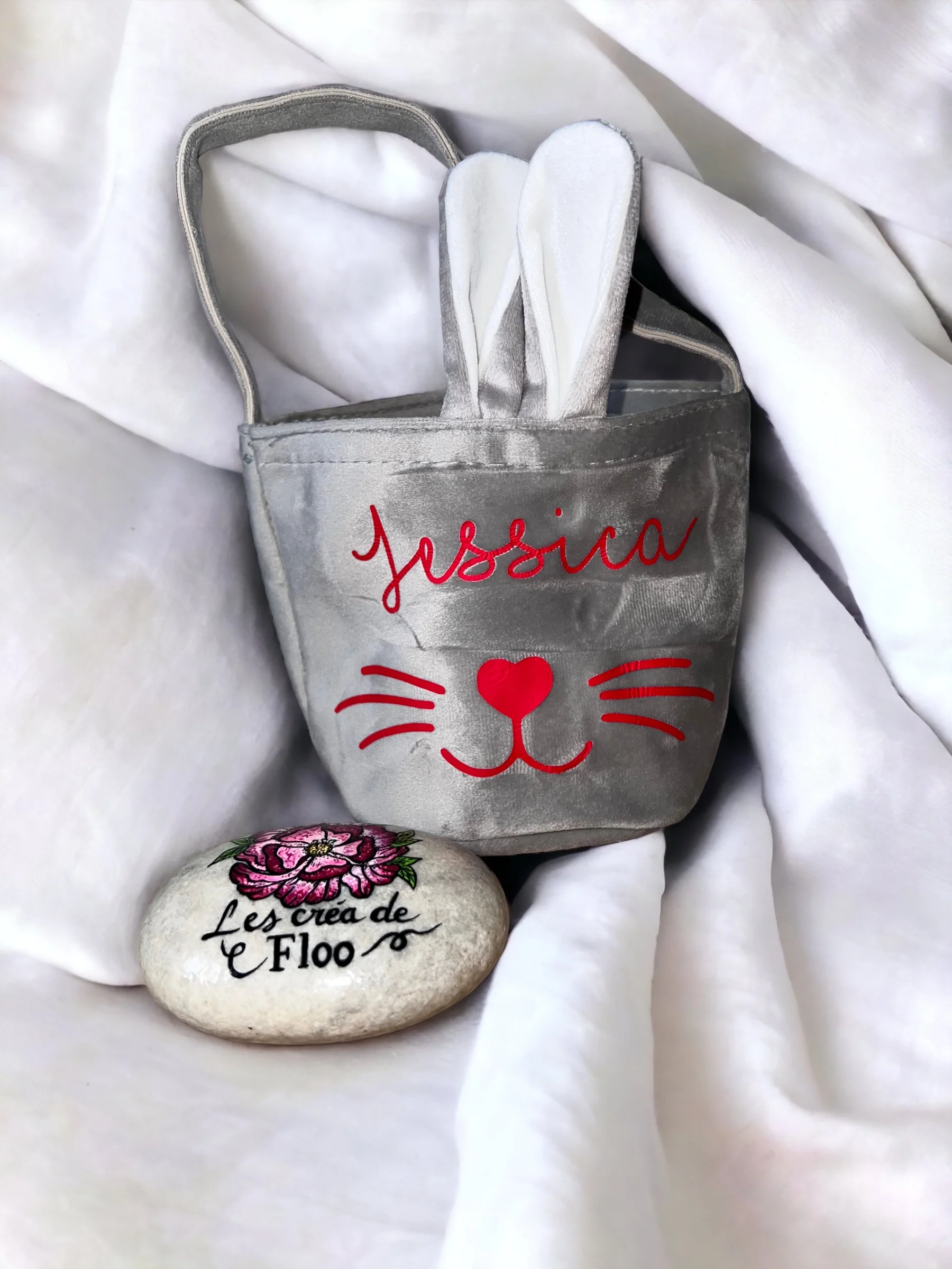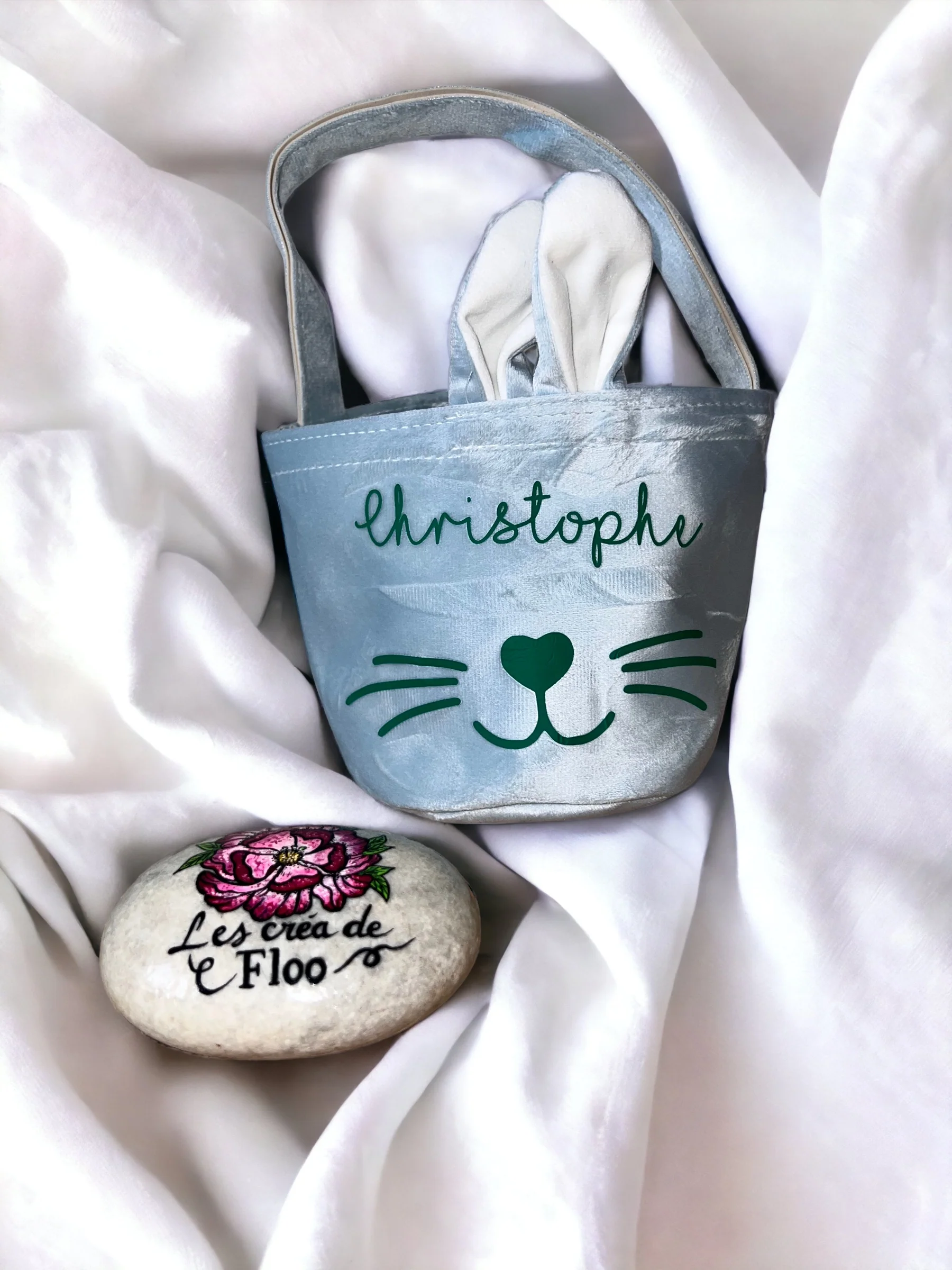 Personnalisable avec le prenom/texte de votre choix ce petit panier avec les oreilles et la petite queue du lapin sera un cadeau idéal pour Pâques.