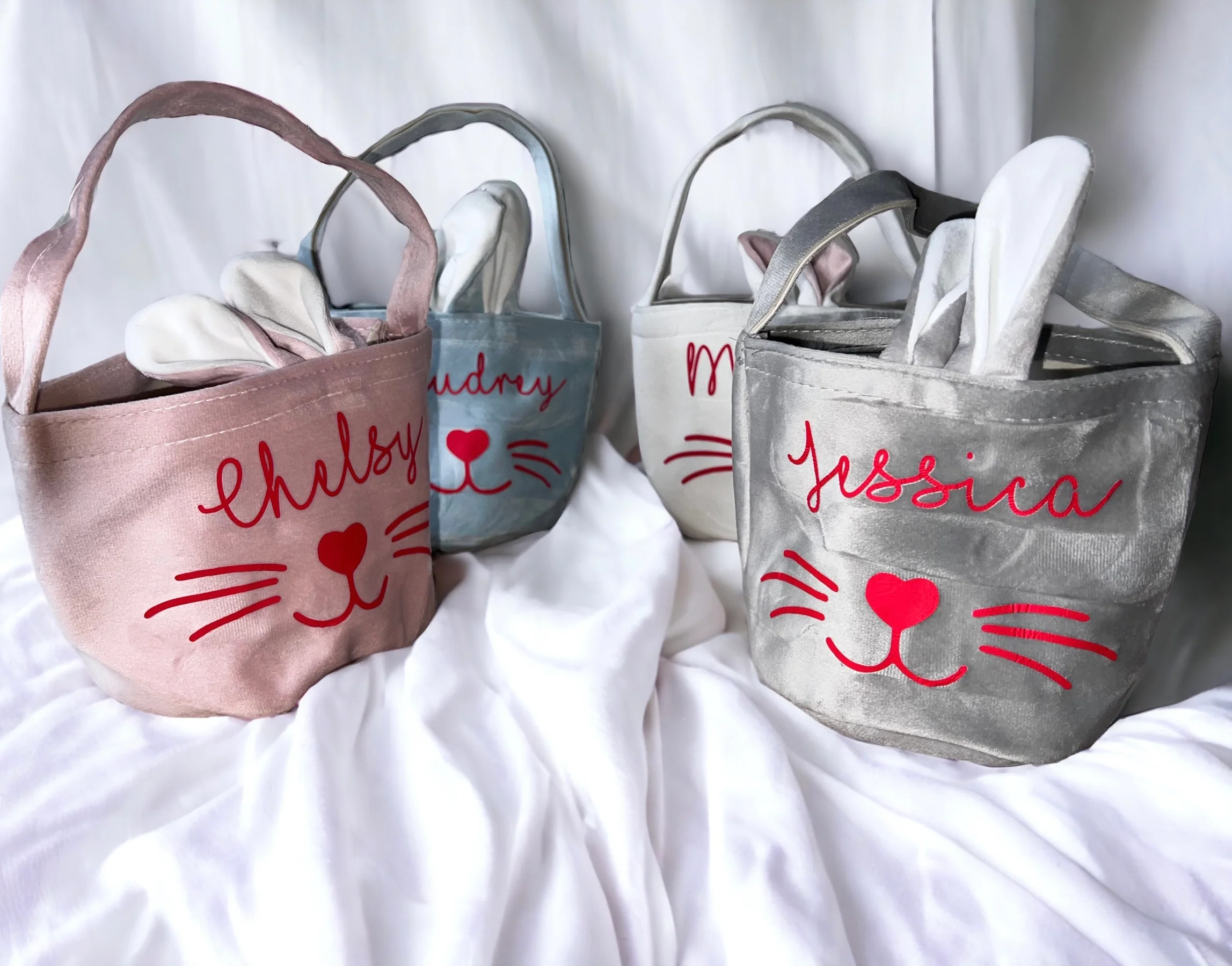 Petit sac, panier en matière velours pour Pâques. Personnalisable avec le prenom/texte de votre choix ce petit panier avec les oreilles et la petite queue du lapin sera un cadeau idéal pour Pâques. Tailles 14x13cm Le texte peut-être personnalisé de la couleur de votre choix ♥️Disponible en plusieurs couleurs ce petit panier sera un succès […]
