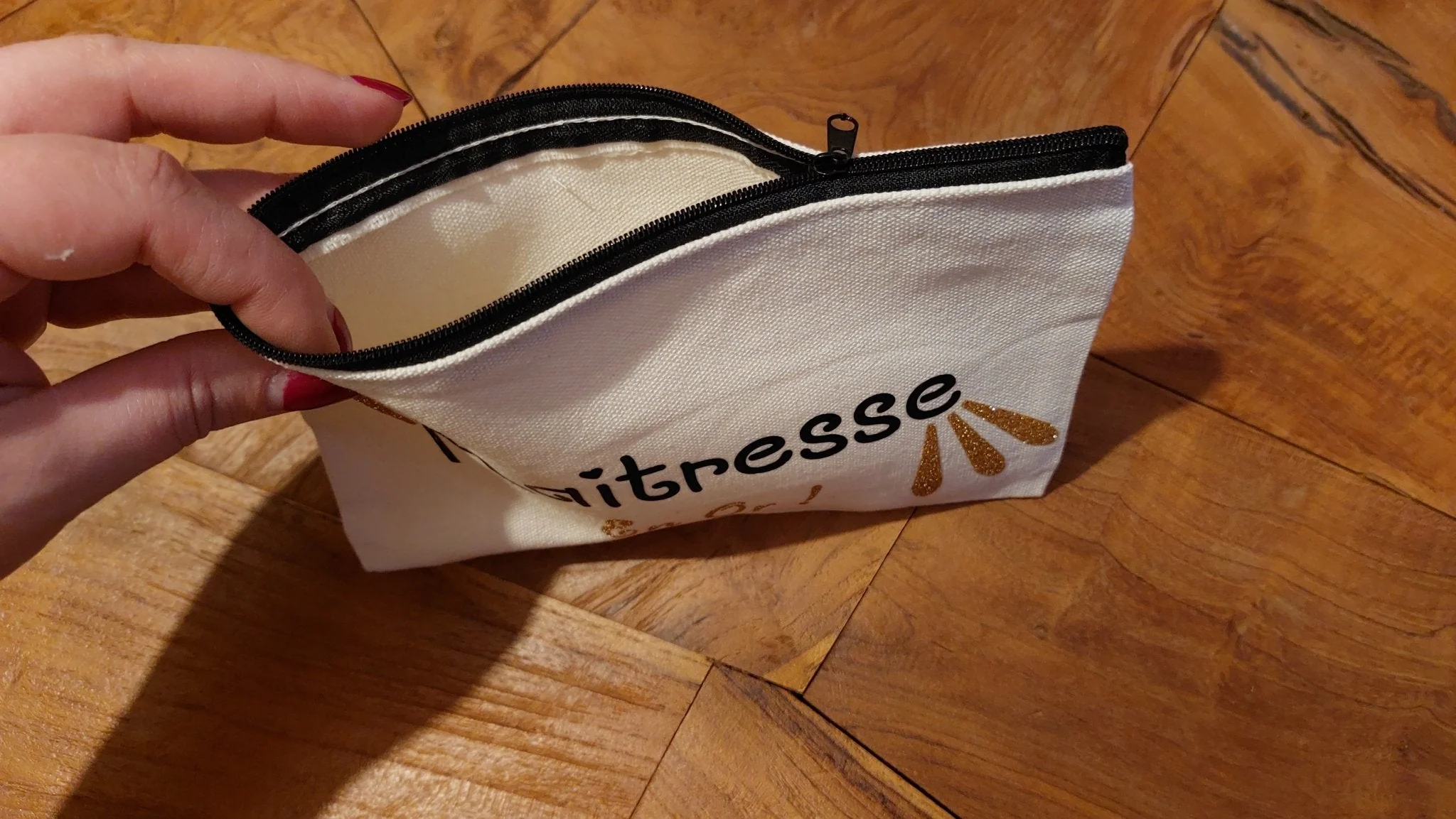 Pochette en toile 13*21cm avec fermeture éclair noir. Trousse lavable en machine sur l’envers. 30°