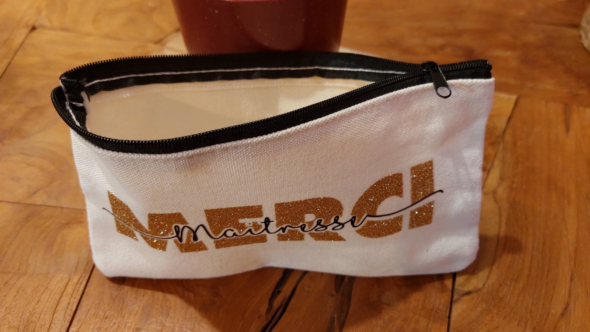 Pochette en toile 100% coton 13*21cm avec fermeture éclair noir. Trousse lavable en machine sur l’envers. 30°