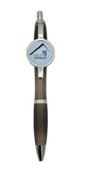 Stylo en pvc rigide avec plaque aluminium ronde Couleur du stylo au choix Couleur d’écriture : noir Texte souhaité à mettre en commentaire de commande.